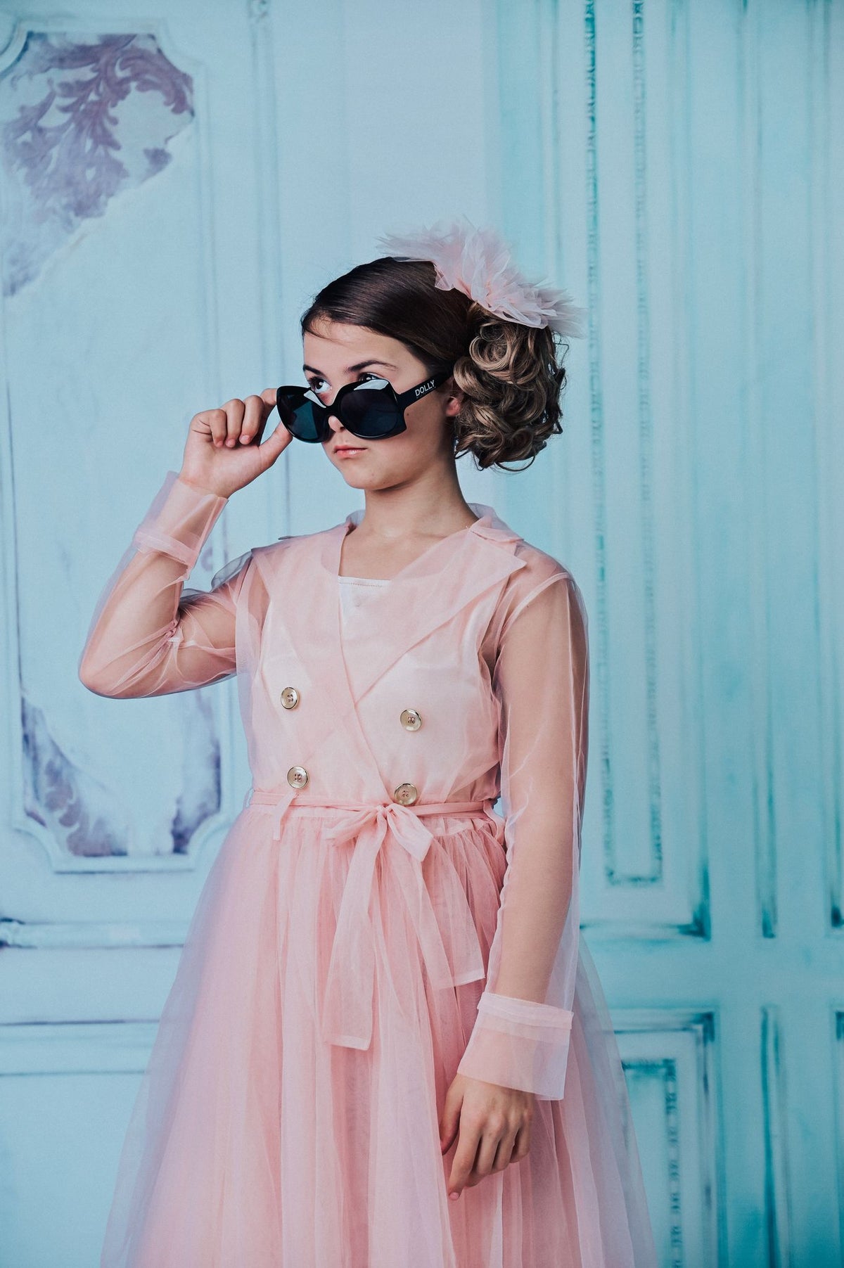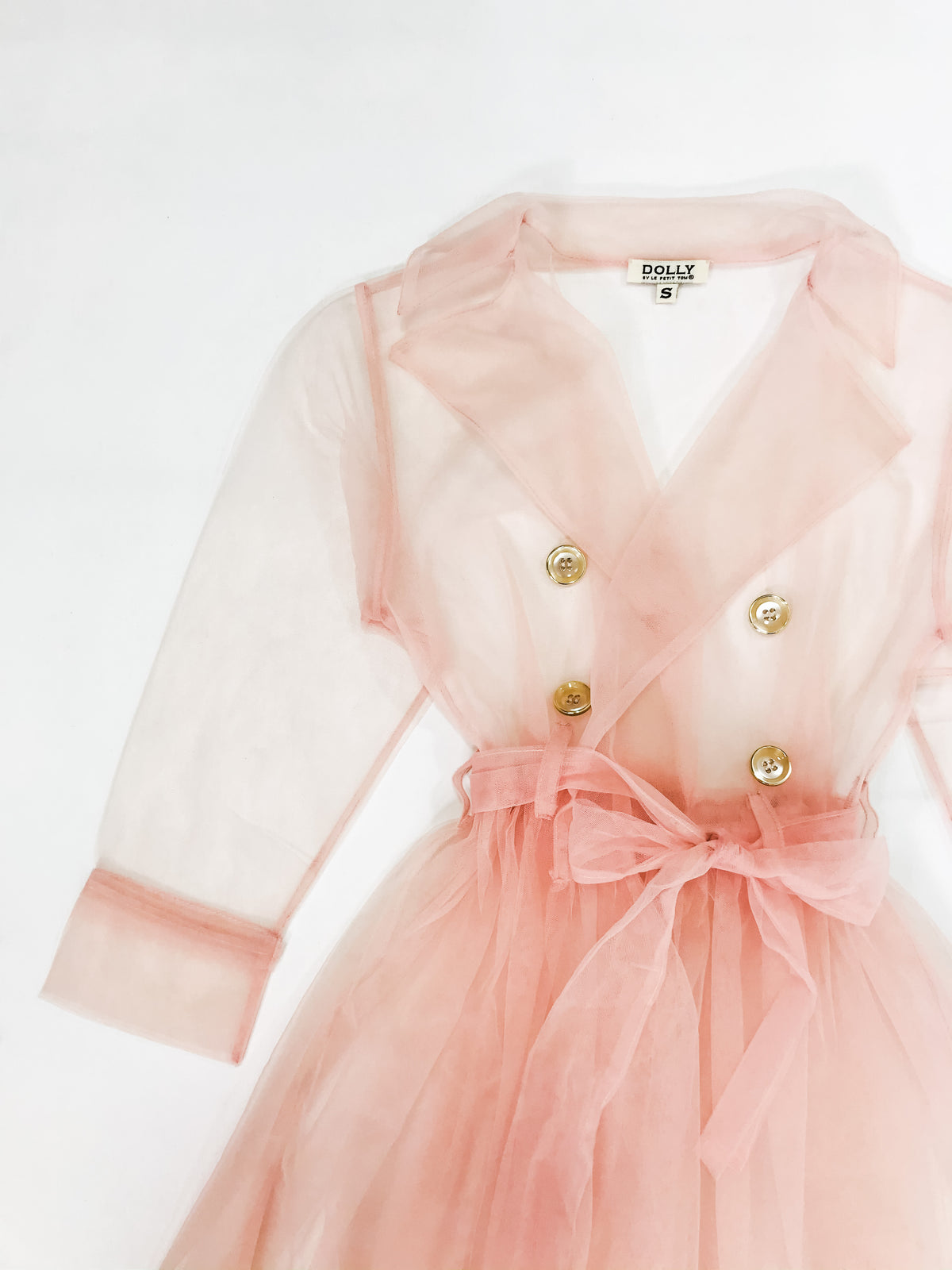 Kõige populaarsemast Dolly värvist – heleroosast – tüllist mantel. Mantlil on kuldsed nööbid, mis lisavad sellele veel ekstra stiili.