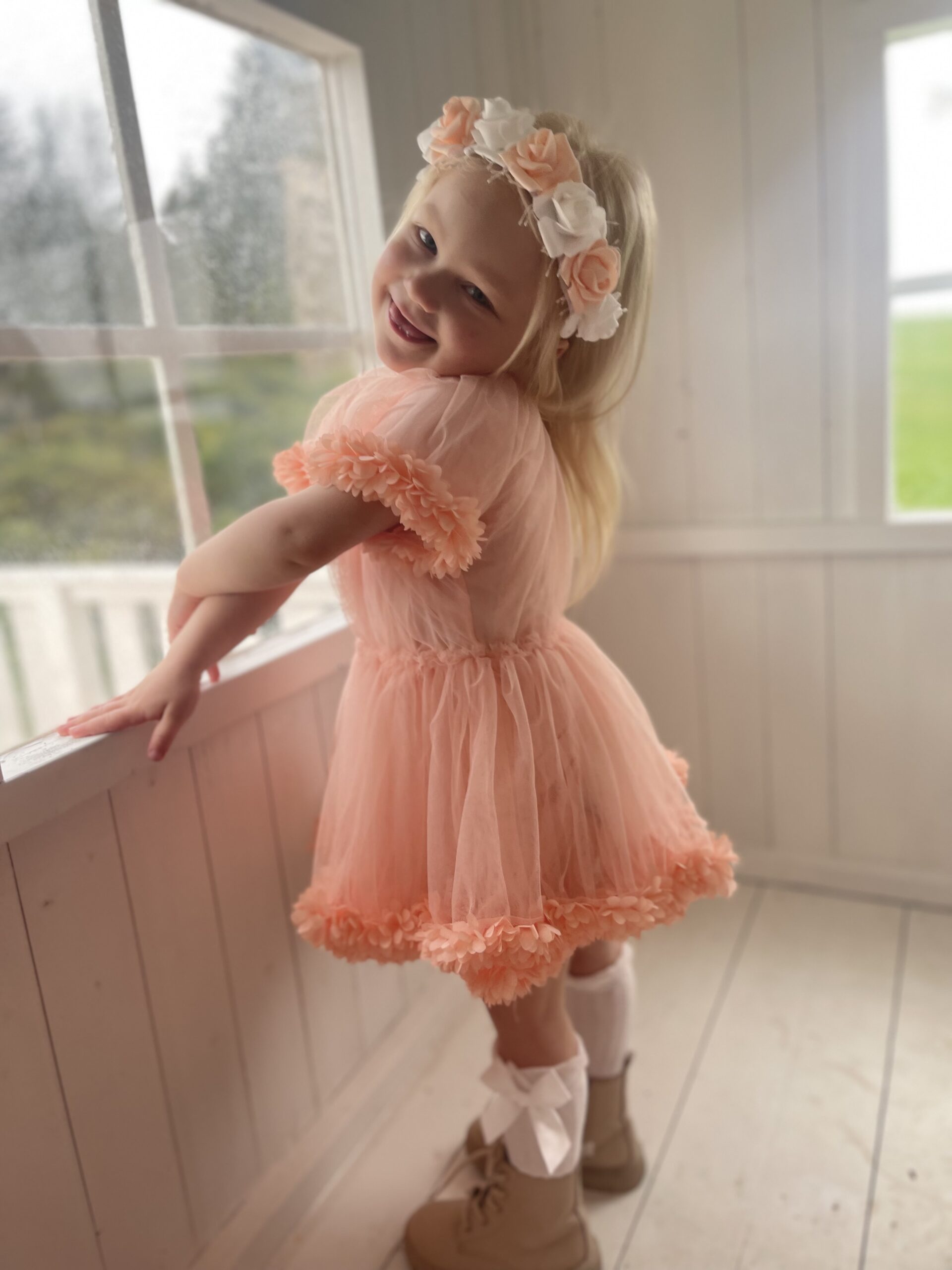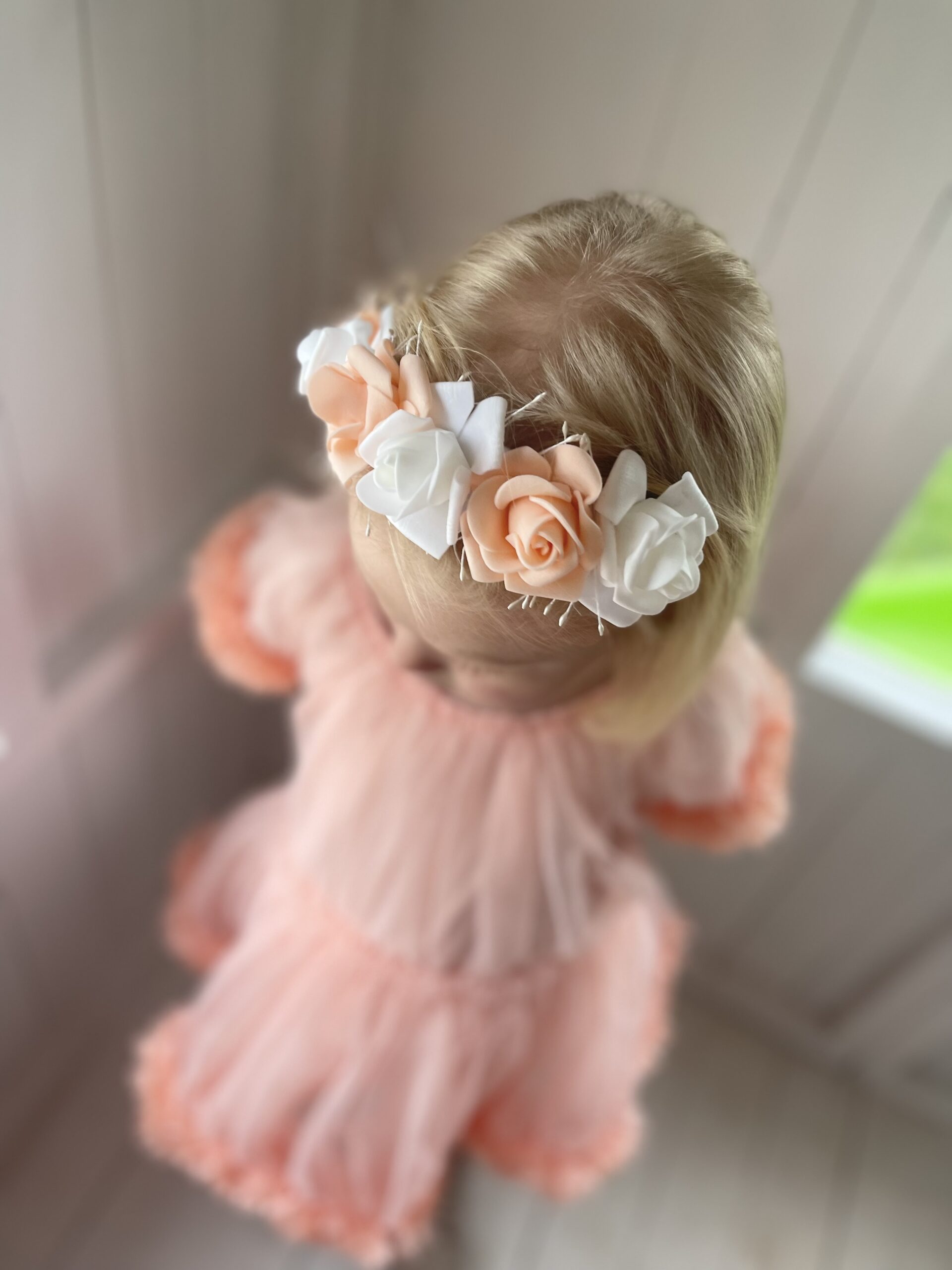 Käsitööna valmistatud kunstlilledest juuksepärg elastikust paelal.