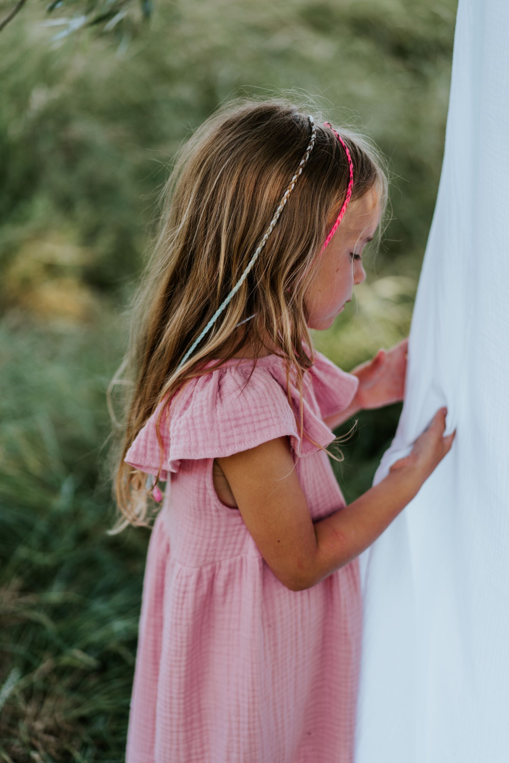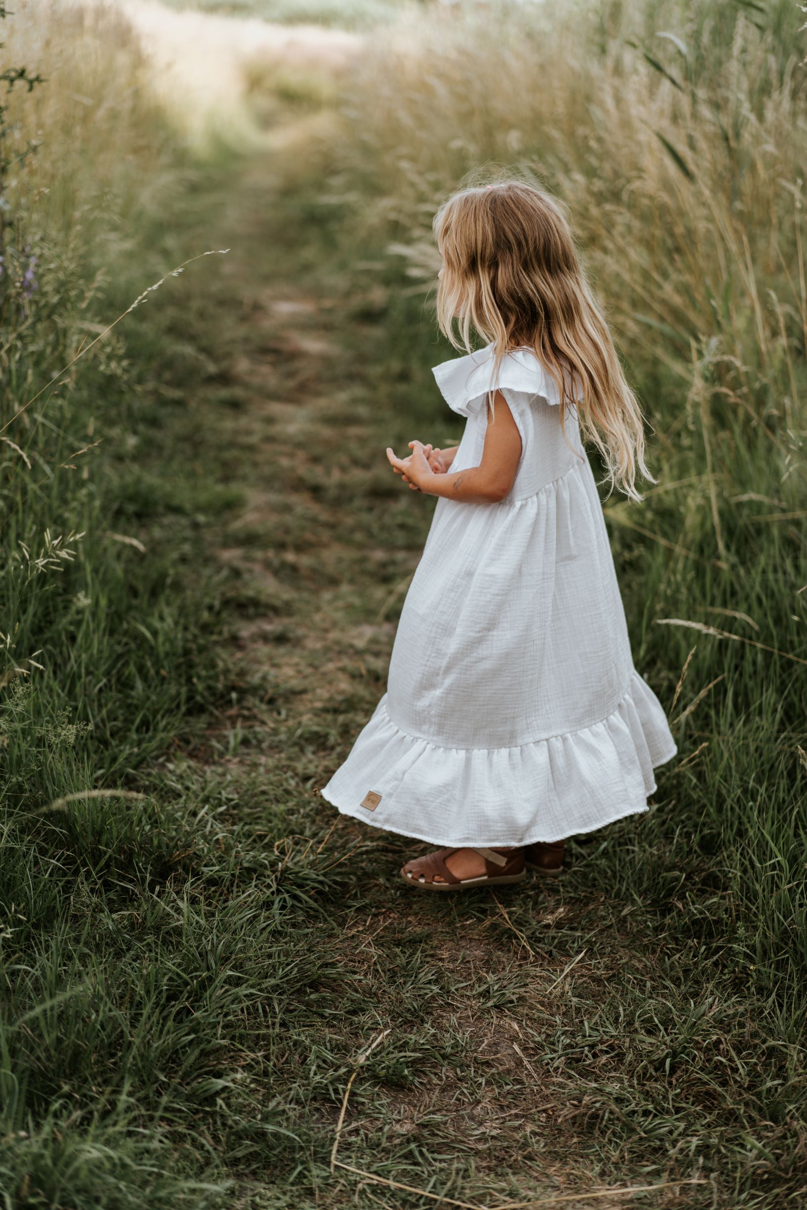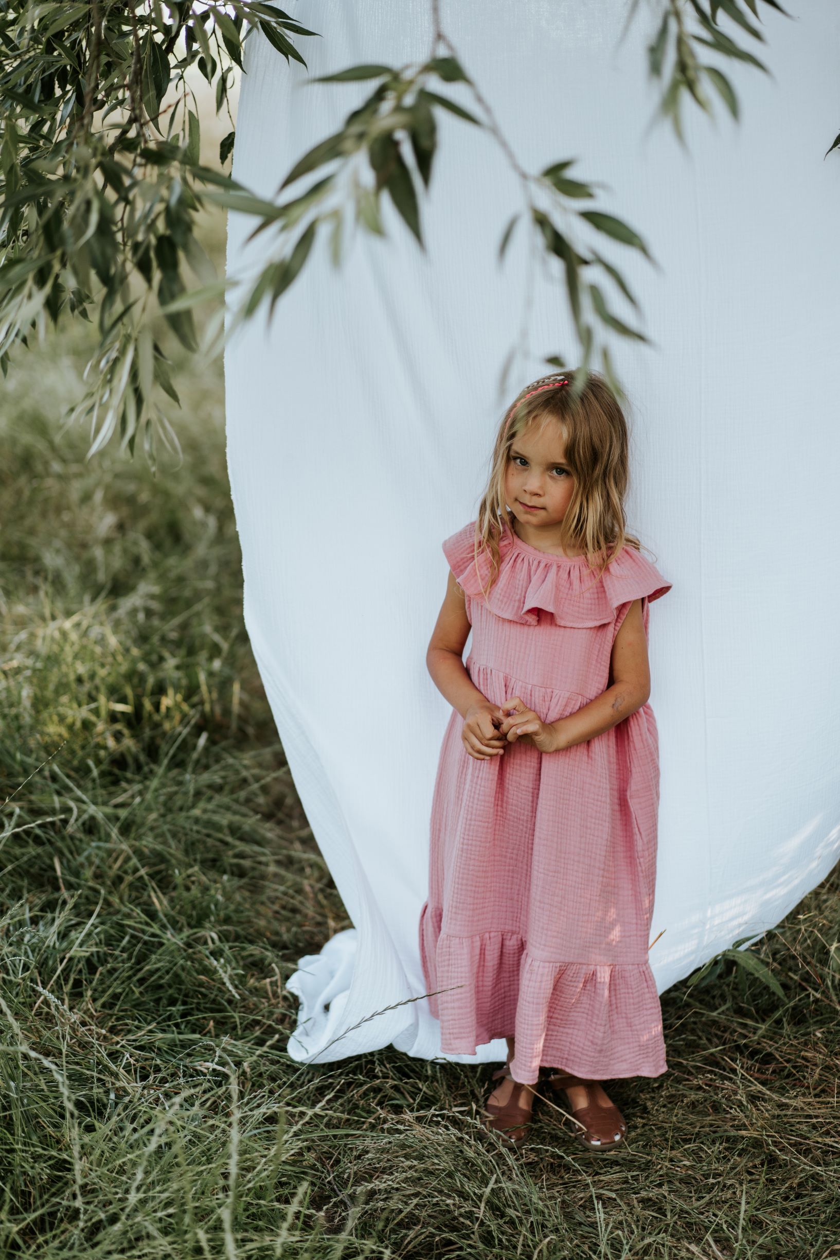 Armas varrukateta maksipikkuses kleit, millel on satsidega krae. Musliinkangas annab sellele mugavust ja õhulisust. Kleit kinnitub seljalt seotavate paeltega. Kleidi lõige annab võimaluse seda kasutada ka lapse kasvades – siis on ta lihtsalt veidi lühem. Lõige on valitud selline, et annab palju ruumi liikumiseks ja ei piira lapse liigutusi.