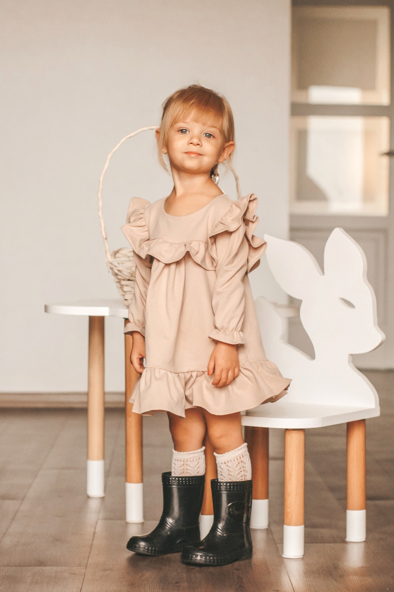 Pikkade varrukatega puuvillasest materjalist kleit, mis on kergelt altlaieneva lõikega. Varruka otstes kumm.