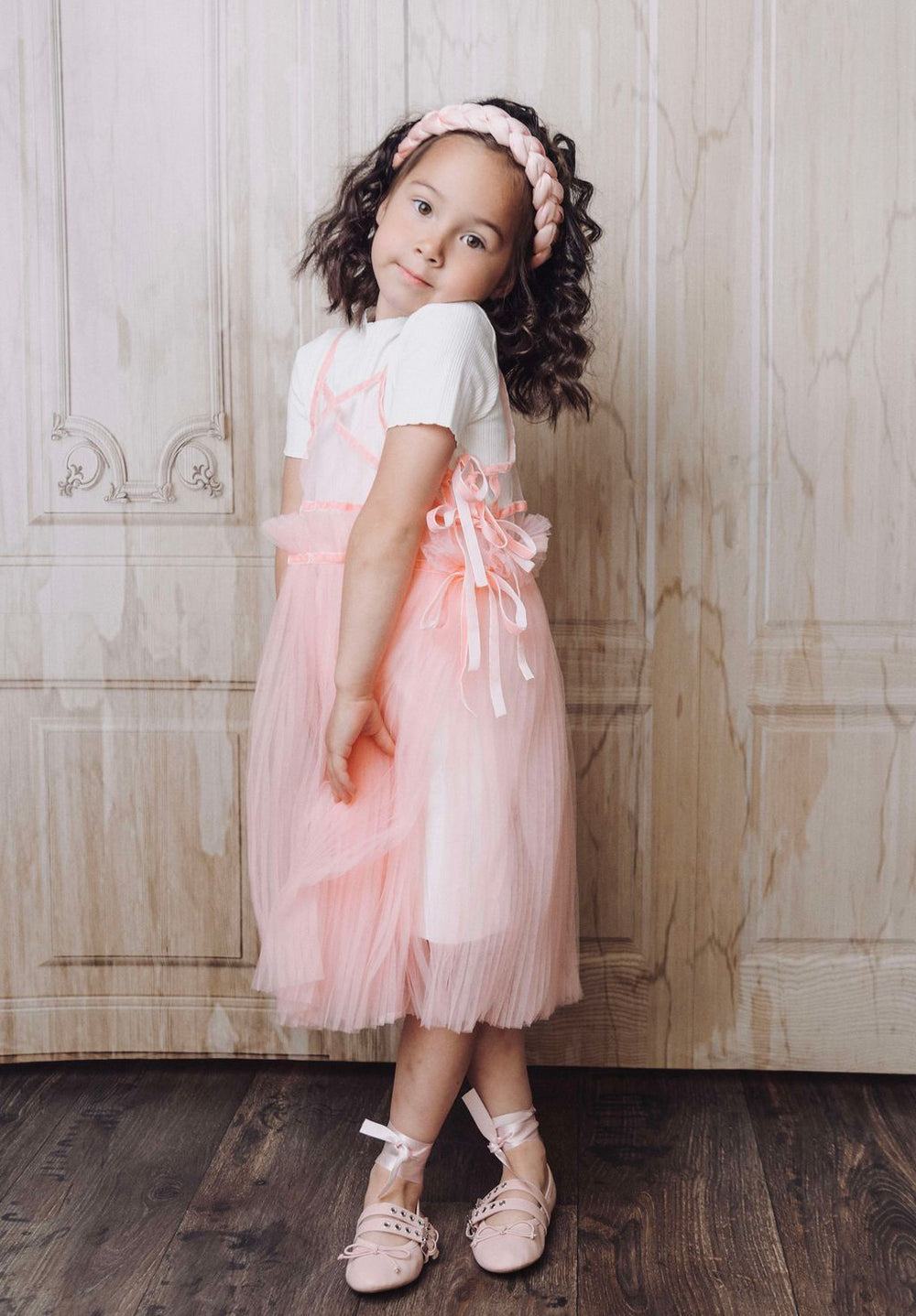 Pehmest lillelisest puuvillasest kangast lühikeste varrukatega kleit. Kaelusel ja varruka otstes on armsad satsid. Esiosale on lisatud armas roosa lips ja seljalt kinnitub kleit nööpidega.