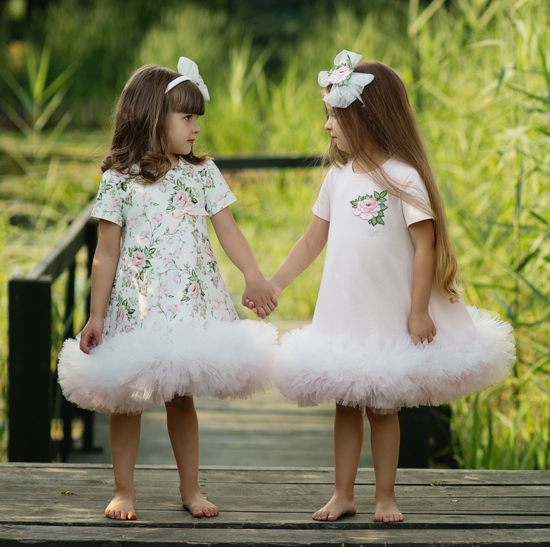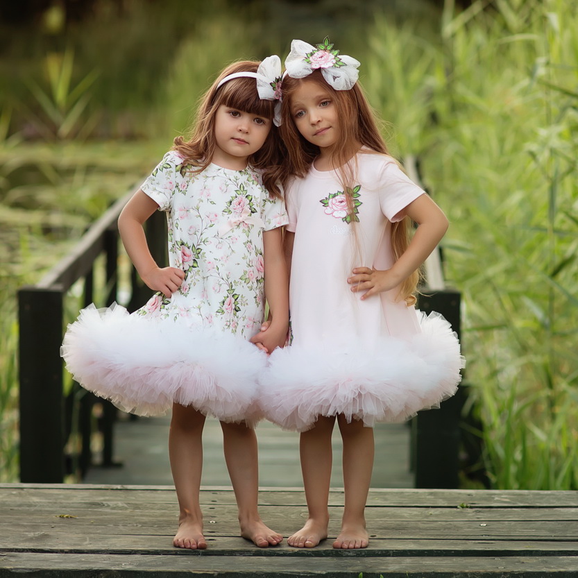 Imeilus puuvillasest elastaanist lühikeste varrukatega roosi mustriga kleit ning roosa ja valge tüllist alläärega. Kleidi esiküljel on kaunistuseks sädelevad kivikesed, mis samuti kaunistavad alumist äärt (kirjas “daga”). Tüllist alläärel on vooder, et see seisaks uhkelt ja keerduvalt. Kleidi ülemine osa on pehmest venivast puuvillast, et lapsel oleks mugav.